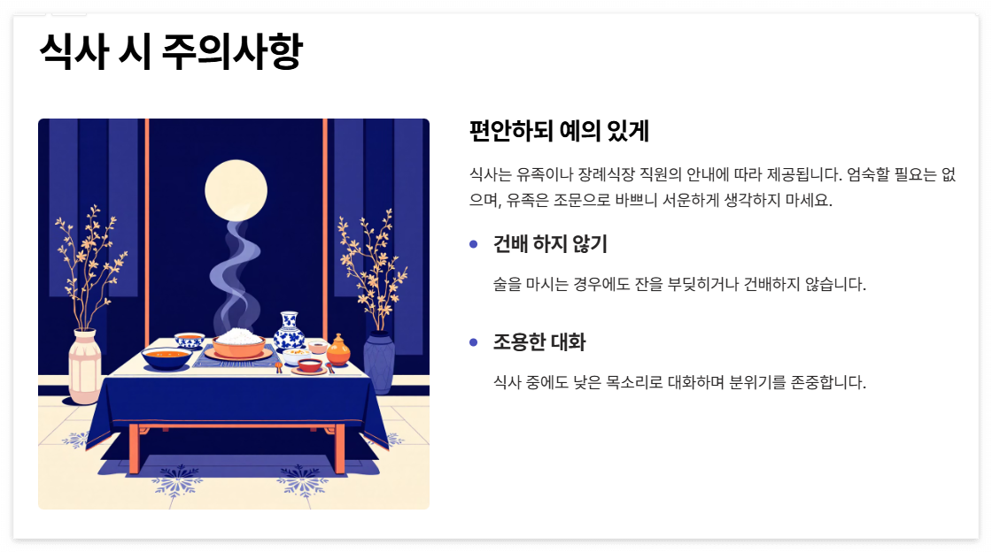 식사는 유족이나 장례식장 직원의 안내에 따라 제공됩니다. 엄숙할 필요는 없고, 유족은 조문으로 바쁘니 서운하게 생각하지 마세요. 술을 마시는 경우에도 건배X, 잔 부딪히기 하시면 안됩니다.