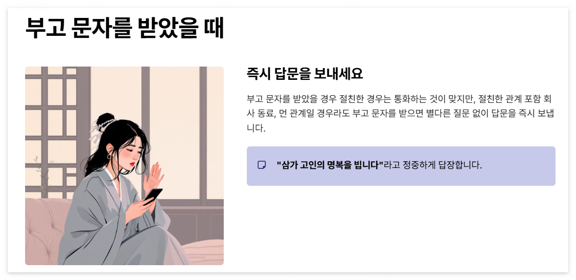 부고 문자를 받지 못했다고 해서 조문을 망설이지 마세요. 유가족은 모든 사람에게 일일이 부고를 알리기 어렵습니다. 상주와의 관계가 있다면 늦더라도 직접 찾아 조의를 전하는 것이 바른 태도입니다.