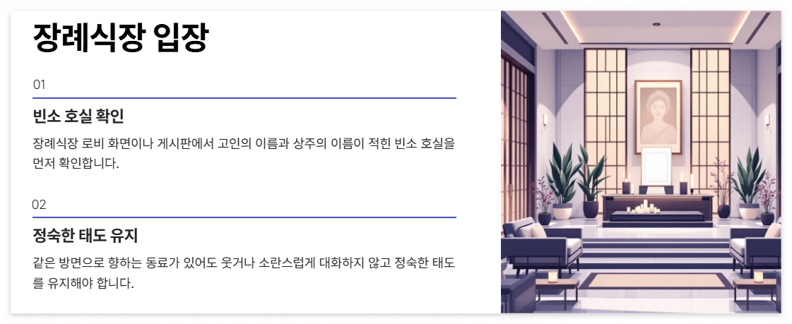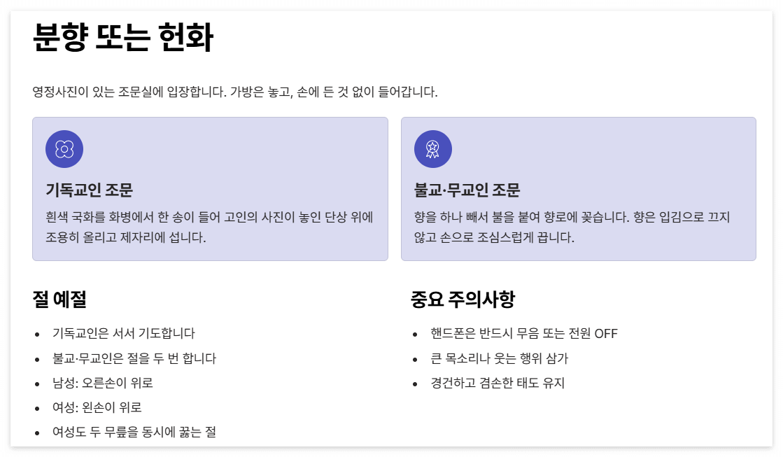 장례식은 누구에게나 낯설고 어렵지만, 조용한 배려와 절제된 태도만 지켜도 충분히 예의를 갖출 수 있습니다.