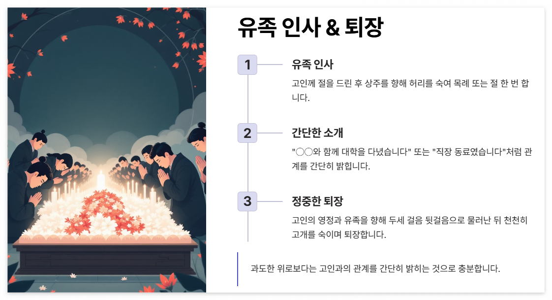 고인께 절을 드린 후에는 상주(유가족)를 향해 허리를 숙여 목례 또는 절 한 번 합니다. 유족과 짧은 인사를 나누되, 과도한 위로보다는 “OO와 함께 대학을 다녔습니다” 또는 “직장 동료였습니다”처럼 고인과의 관계 또는 유가족과의 관계 정도를 간단히 밝히는 것으로 충분합니다.