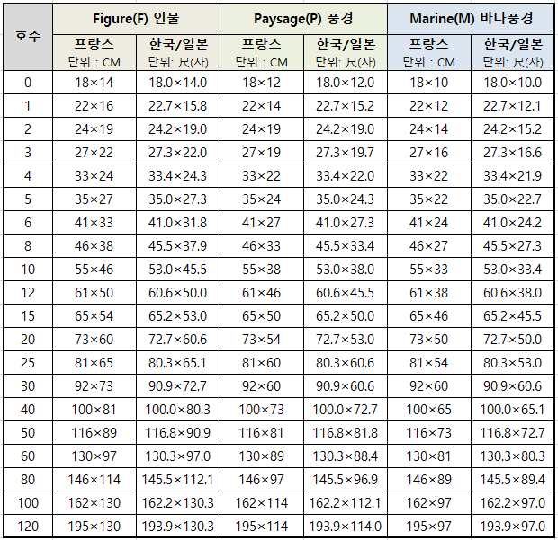 - 인물형화 캔버스 치수, 풍경화 캔버스 치수, 바다풍경 캔버스 치수가 다르고 각 앞에 F,P,M이 붙는다.