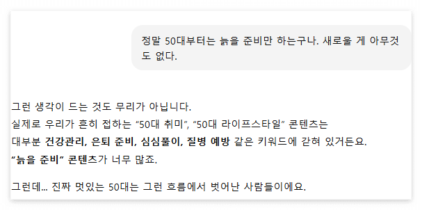 chat GPT가 대답했다. 50대 컨텐츠는 "늙을 준비"에 갇혔다.