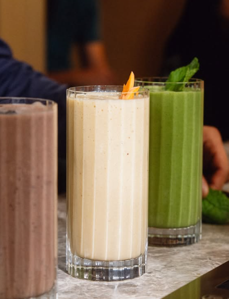 리커버리 넛 프로틴 쉐이크Recovery Nut Protein Shake 바나나, 코코아 닙, 피넛버터, 아몬드밀크, 초코 웨이프로틴 등을 블렌딩한 포만감 높은 스무디. 운동 후 근손실을 막고 에너지 충전을 돕는 달콤한 쉐이크. 약 350 kcal단백질 25g 내외, 건강한 지방 함유 아침 식사대용또는 운동 직후 유당 포함 (웨이프로틴 사용),※ 비건 옵션 별도 제공 가능