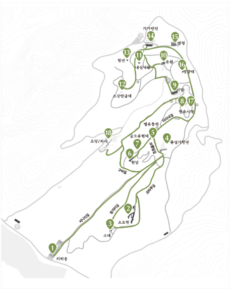 코스: 치허문 → 소요헌 → 소대 → 풍설기천년 → 별유동천 → 현암 → 한유시경 → 사담 → 유원 → 명정 → 오당/와사