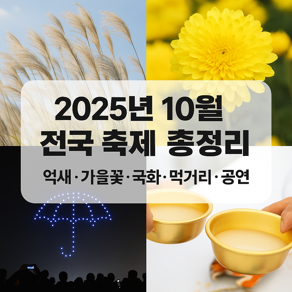 2025년 10월, 전국 곳곳에서 가을 정취를 물씬 느낄 수 있는 축제들이 열립니다. 억새와 가을꽃이 장관을 이루는 자연 축제부터 국화 전시, 드론쇼, 전통문화 체험, 그리고 지역별 먹거리와 공연까지 다채로운 행사가 준비되어 있습니다. 이번 글에서는 서울, 경기·인천, 강원, 충청, 전라, 경상, 제주까지 주요 지역별 10월 축제 일정을 한눈에 정리했습니다