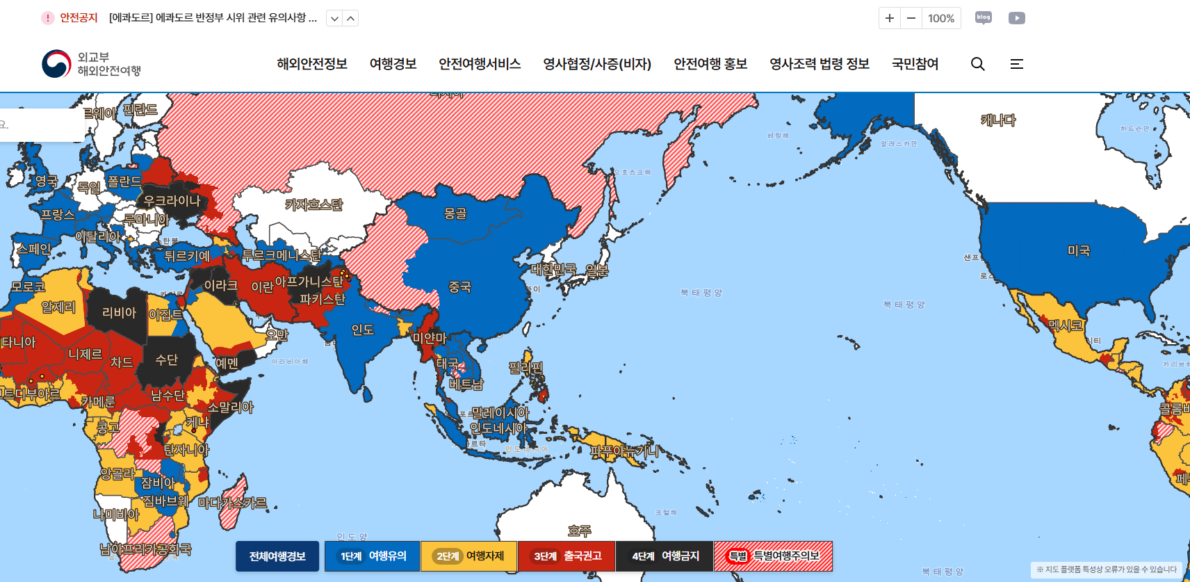 외교부 해외 안전 여행 페이지를 확인하면 여행 위험 단계를 알 수 있다.
