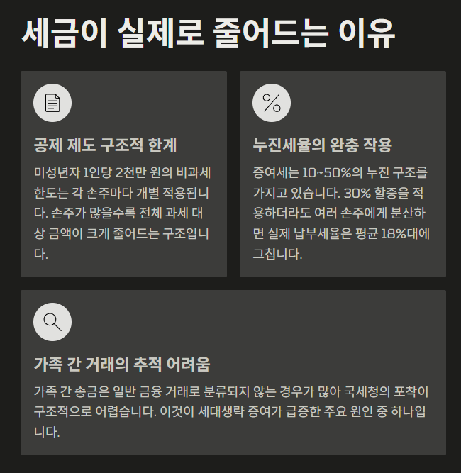 | ① 세대 건너뛰기 증여 | 조부모 → 손주 직접 증여 | 자녀 단계를 생략해 증여세 1회만 납부. 30% 할증이 붙지만 실효세율 낮음. | 상속·증여세 이중 과세 회피. 부의 대물림 가속화. |
