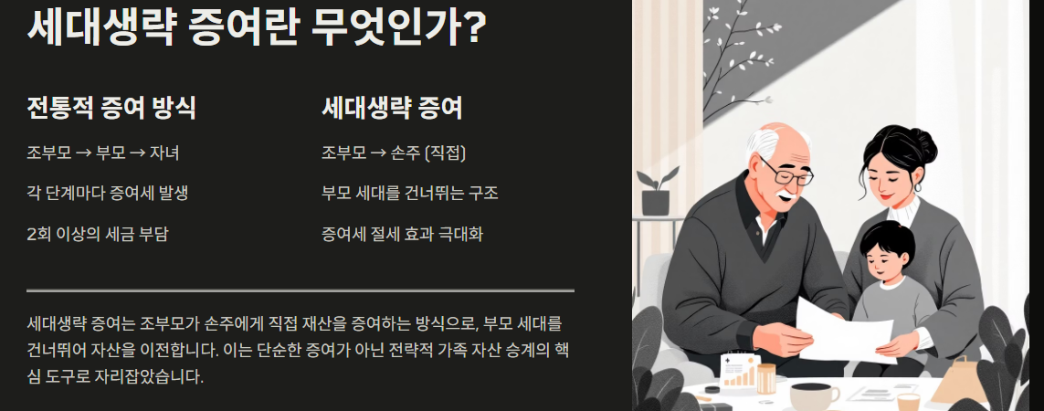 세대생략 증여란 조부모가 자녀를 거치지 않고 손주에게 직접 재산을 이전하는 행위입니다.