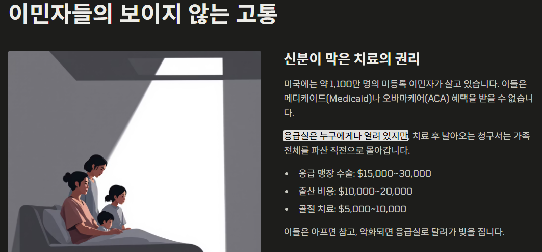 - 저소득층 노동자: 시급으로 생계를 유지하지만 고용보험이 없어, 개인 보험을 들어야 하는데 월 200~400달러조차 부담스러워 무보험 상태로 지냅니다.