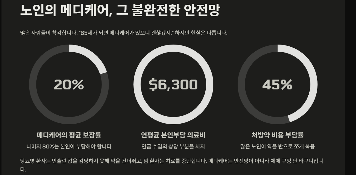 - 노인과 만성질환자: 메디케어(Medicare)가 있어도 약값·시술비·간병비 등은 대부분 본인 부담입니다. 결국 저축을 모두 탕진하거나 치료를 포기합니다.