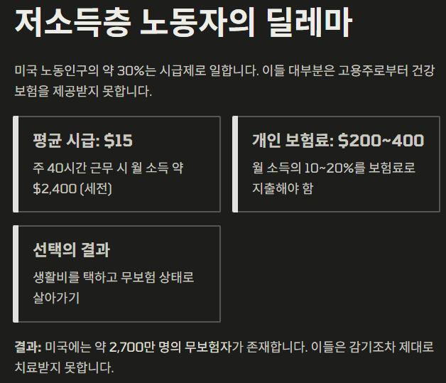 - 저소득층 노동자: 시급으로 생계를 유지하지만 고용보험이 없어, 개인 보험을 들어야 하는데 월 200~400달러조차 부담스러워 무보험 상태로 지냅니다.