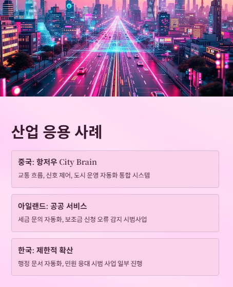 | 도시 / 교통 / 스마트 시티 | 한국에서는 일부 지자체나 정부 기관이 AI 챗봇, 행정 문서 자동화, 민원 응대 자동화 시범 사업을 진행 중인 보도 있음 (명확 규모 공개는 적음) | 항저우의 City Brain 프로젝트: 교통 흐름 조정, 신호 제어, 도시 운영 자동화 등이 포함됨. | 아일랜드 정부는 공공 부문 AI 책임 사용 지침과 함께 여러 부처에서 AI 시범사업을 추진 중임. 예: 세금 문의 자동화, 보조금 신청 오류 감지 등이 지침 발표 자료에 포함됨. (gov.ie) |