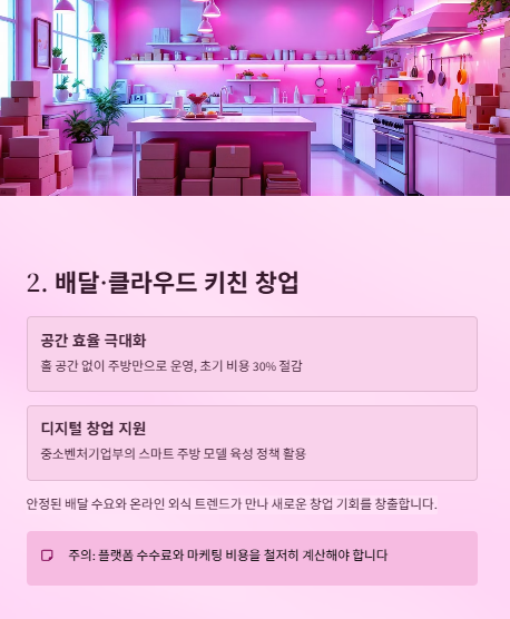 - 정책 근거: 중소벤처기업부의 2025년 창업 지원 계획에는 디지털 기반 창업 및 유통·배송 지원이 포함됨. 특히 클라우드 키친, 스마트 주방 모델에 대한 관심 증가. (출처)