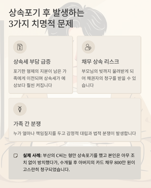 - 가족 간 분쟁 유발: 누가 얼마큼 책임질지, 상속 포기로 인한 감정적 대립 발생