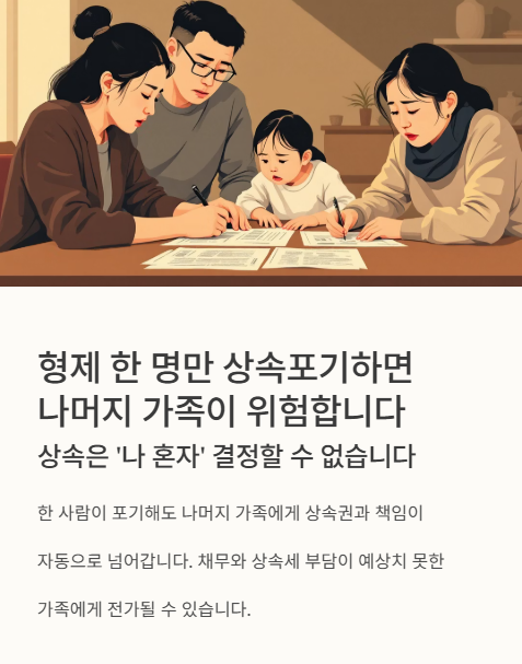 상속은 감정보다 ‘법적 절차’가 먼저입니다. 형제 중 누군가 포기하기로 결정했다면, 남은 가족 모두가 함께 판단하고 준비해야 상속세·채무 폭탄을 피할 수 있습니다.