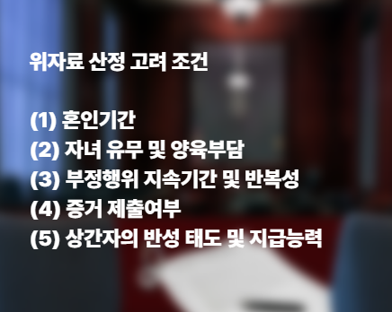 위자료 액수 산정 시 고려되는 조건으로는 (1) 혼인기간, (2) 자녀 유무 및 양육부담, (3) 부정행위 지속기간 및 반복성, (4) 증거 제출여부, (5) 상간자의 반성 태도 및 지급능력 등이 있습니다.