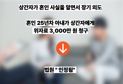 예시 판례: 혼인 25년차 아내가 상간자에게 위자료 3,000만 원 청구 → 상간자가 혼인 사실을 알면서 장기 외도 → 인정됨