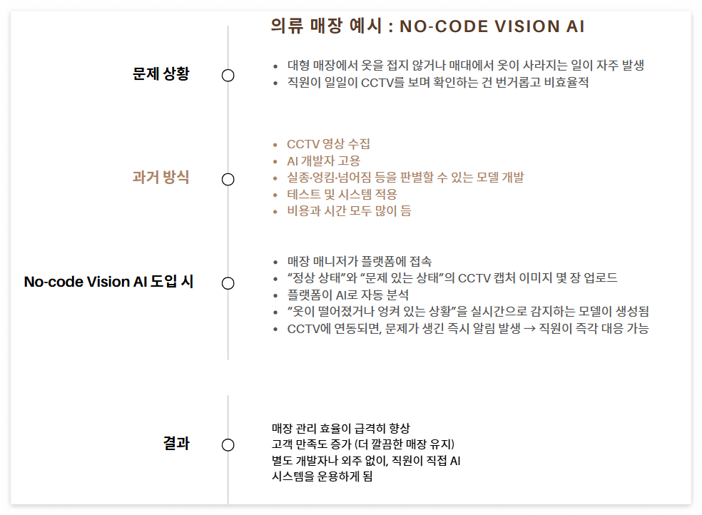 • No-code AI 도입: 매장 사진 몇 장 업로드 → '정상/문제 상황' 표시 → AI가 학습 후 실시간 감지 시스템 구축
