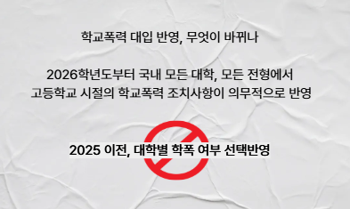 2026학년도부터 국내 모든 대학, 모든 전형에서 고등학교 시절의 학교폭력 조치사항이 의무적으로 반영된다. 이는 학생부종합전형뿐만 아니라 교과전형, 수능위주 전형, 논술전형, 실기·실적전형까지 포함한 모든 입시 전형에 해당된다. 그동안 일부 대학에서 자율적으로 반영하던 사항이었지만, 이제는 교육부의 정책에 따라 모든 대학이 이를 고려해야 하는 구조로 바뀐 것이다.