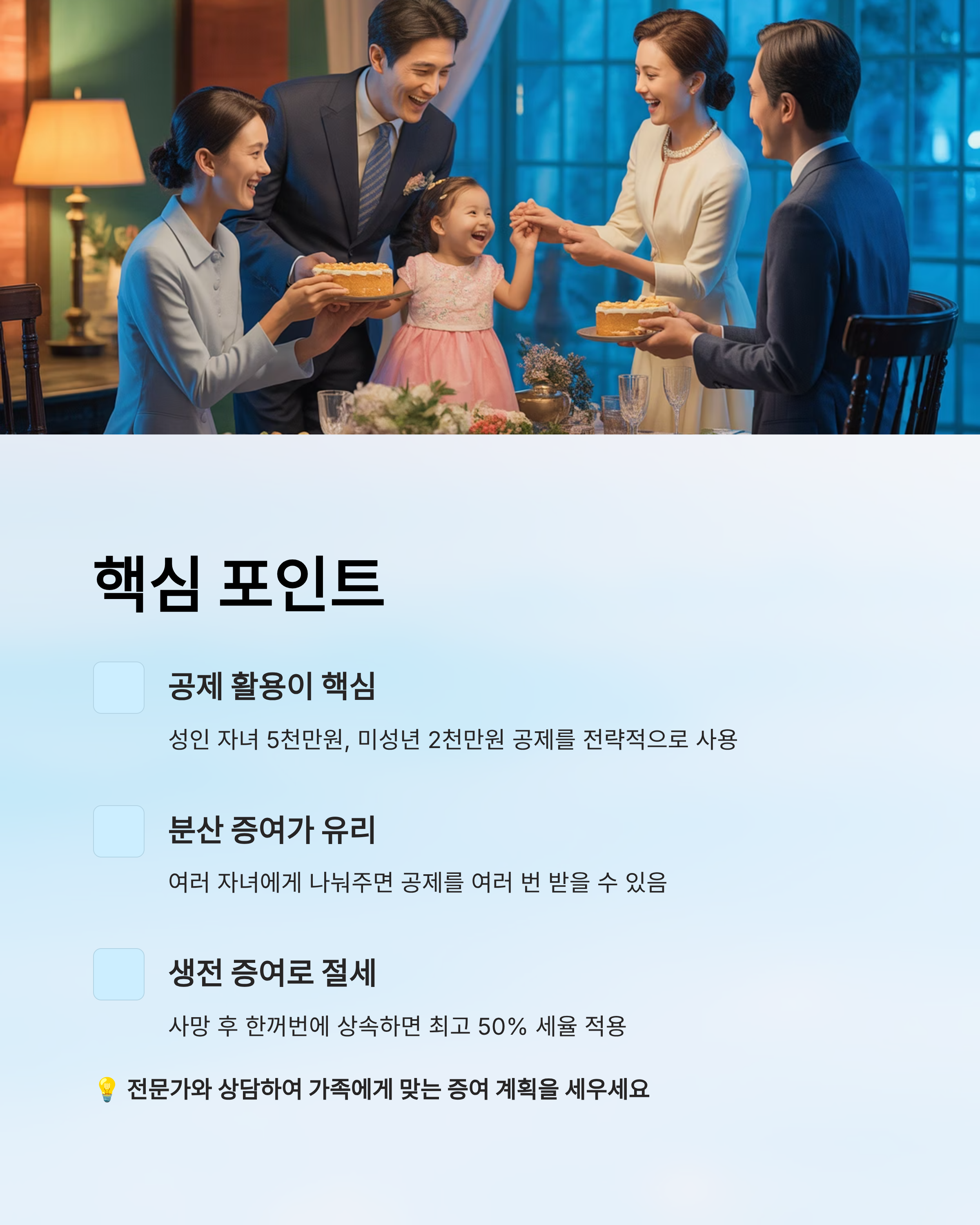 ➡ 포인트: 분산 증여는 공제 혜택을 두 번 사용할 수 있어 세금을 완전히 없앨 수도 있습니다.