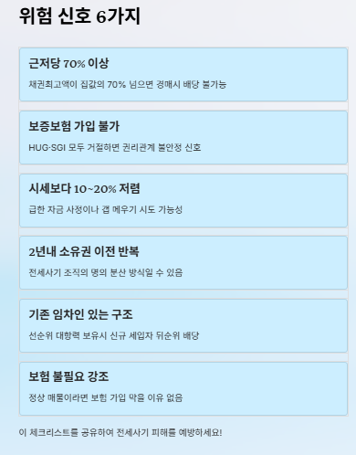 아래 기준은 실제 전세사기·깡통전세 피해 사례에서 공통적으로 나타난 위험 신호입니다.