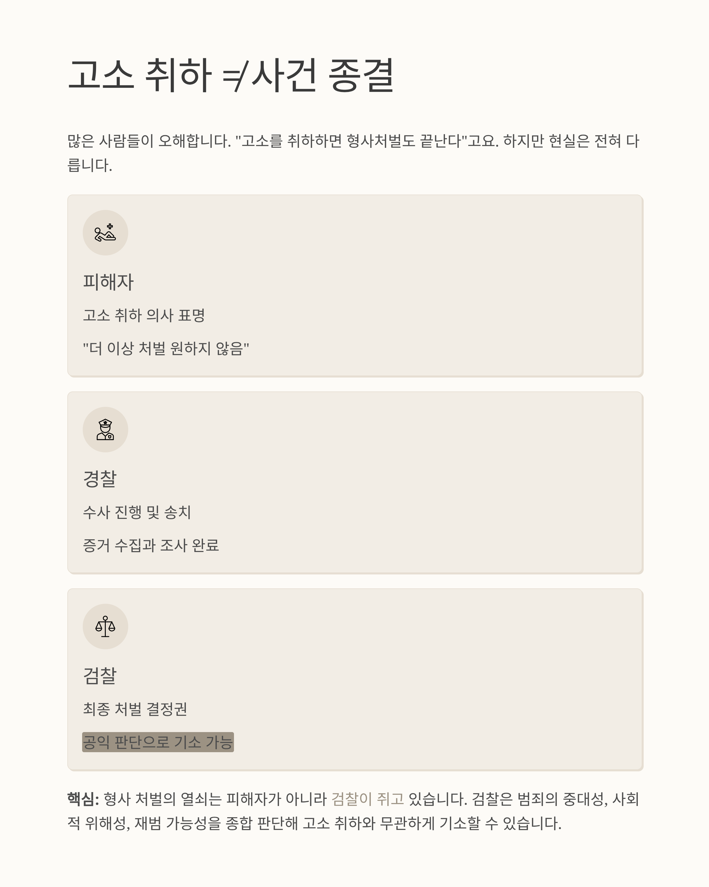 많은 사람들이 “고소를 취하하면 사건이 끝난다”고 생각합니다.