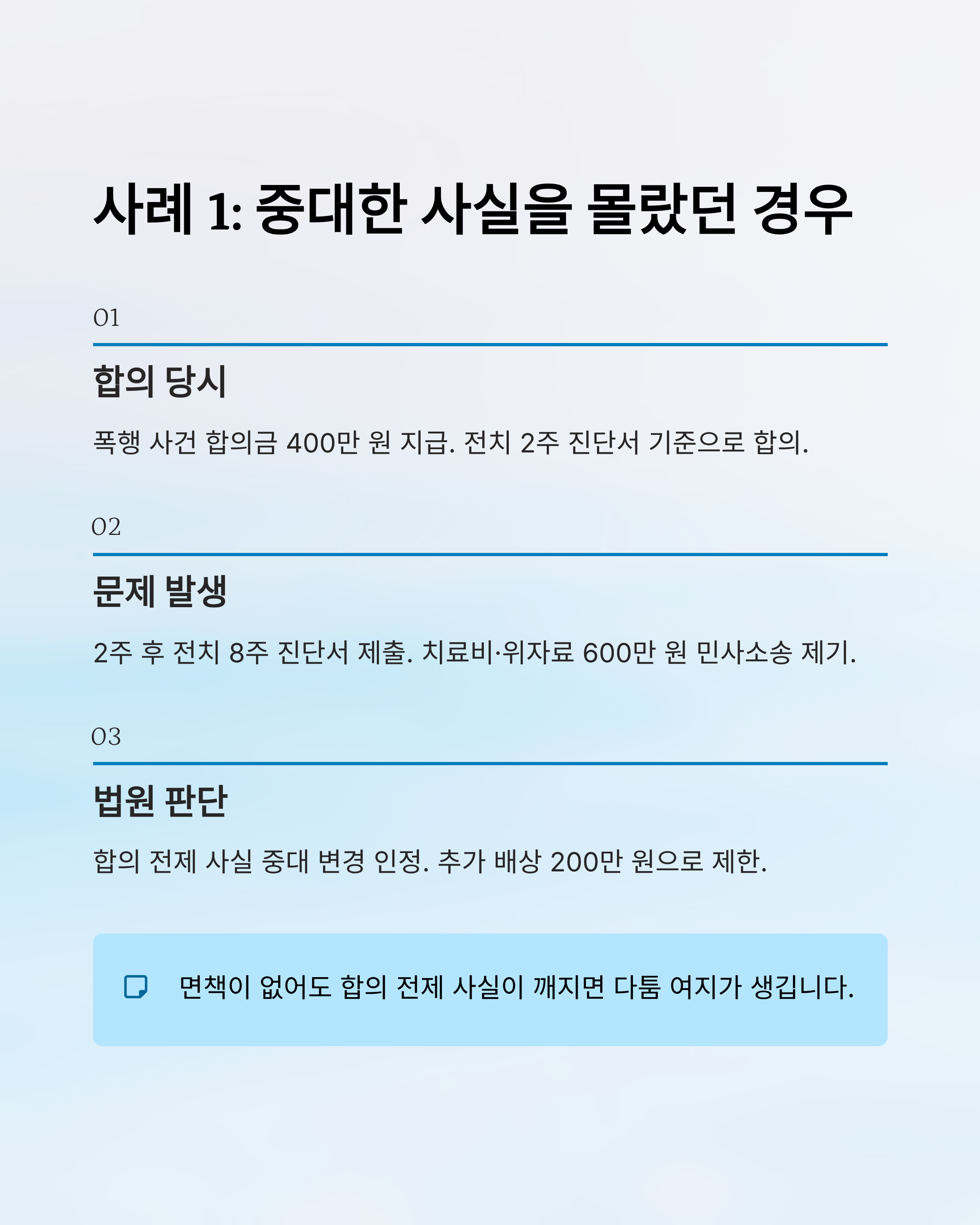 • 합의 당시 알지 못한 중대한 사실이 뒤늦게 드러난 경우