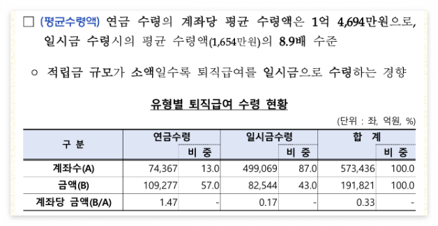 고용노동부에서 발표한 [퇴직 연금 적립금 운영 현황 보고서 2024]와 고용노동부 퇴직연금 복지과의 보도자료 [2021.1.5/ ’ 확정기여형, 개인형 퇴직연금‘ 적립금이 처음 100조 원 돌파]에 대한 내용까지 통계치를 정리해 보면 위와 같습니다. '일시금 수령비율은 100명 중 87명'이지만 금액비율로 봤을 때 당연하게도 고액의 퇴직금은 연금으로 수령하기를 선택하는데 어느 정도인지 관련 자료를 참조자료로 붙여볼게요.
