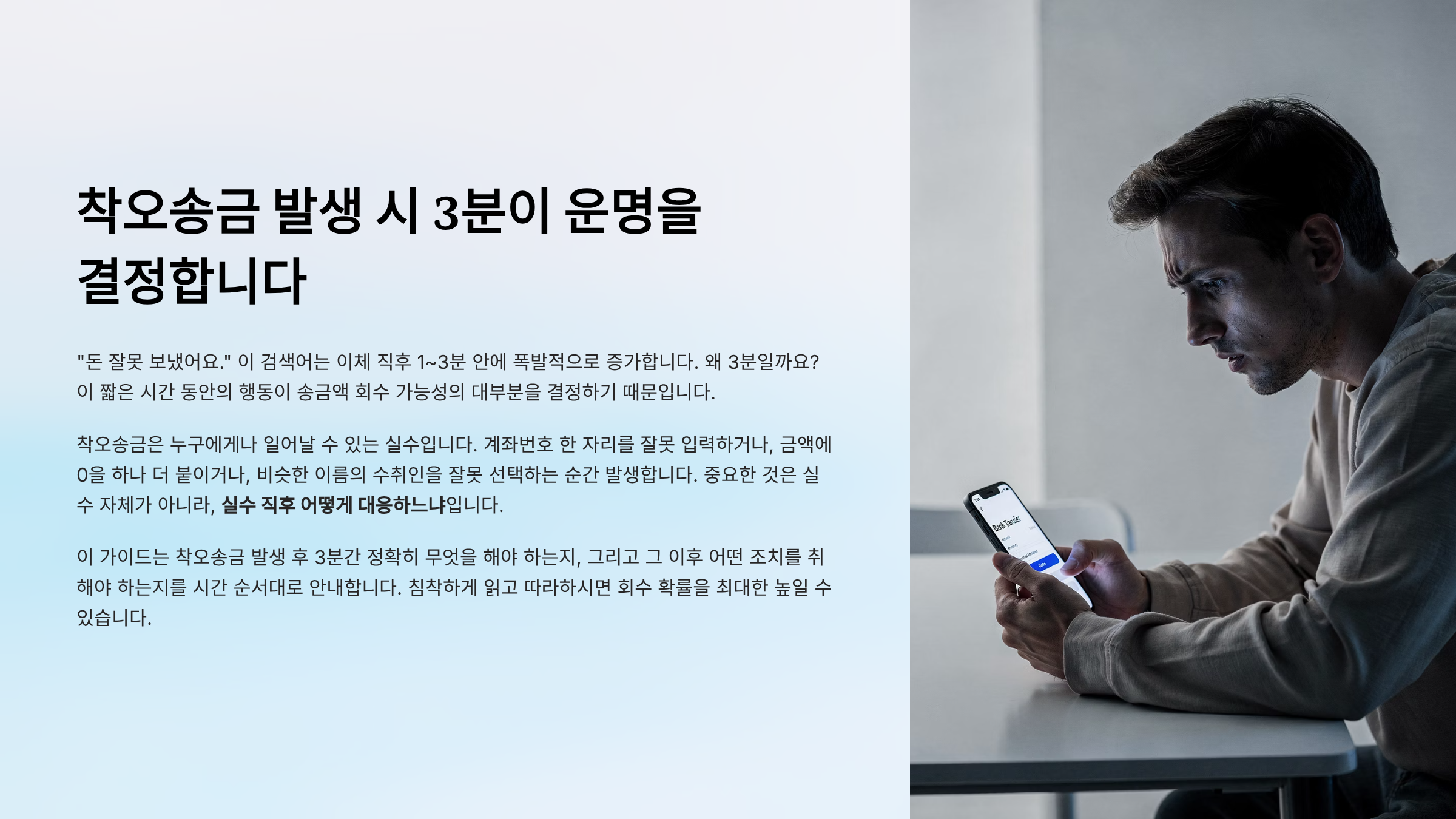 착오송금 검색은 이체 직후 1~3분 안에 폭발합니다. 이때의 행동이 회수 가능성의 대부분을 결정합니다.