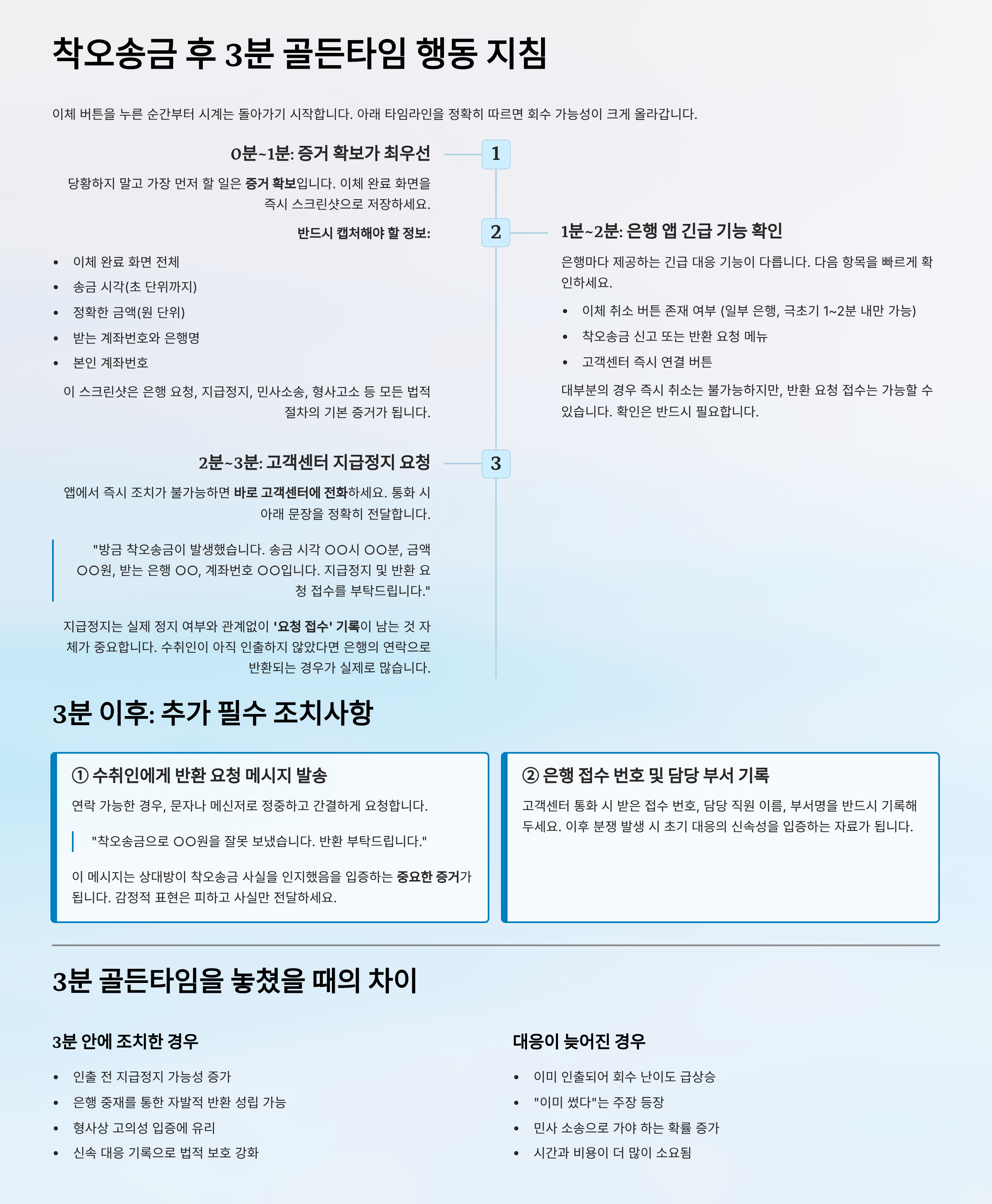 - 고액(수천만 원 이상): 초기 3분 조치 + 법적 절차 준비가 필수입니다.