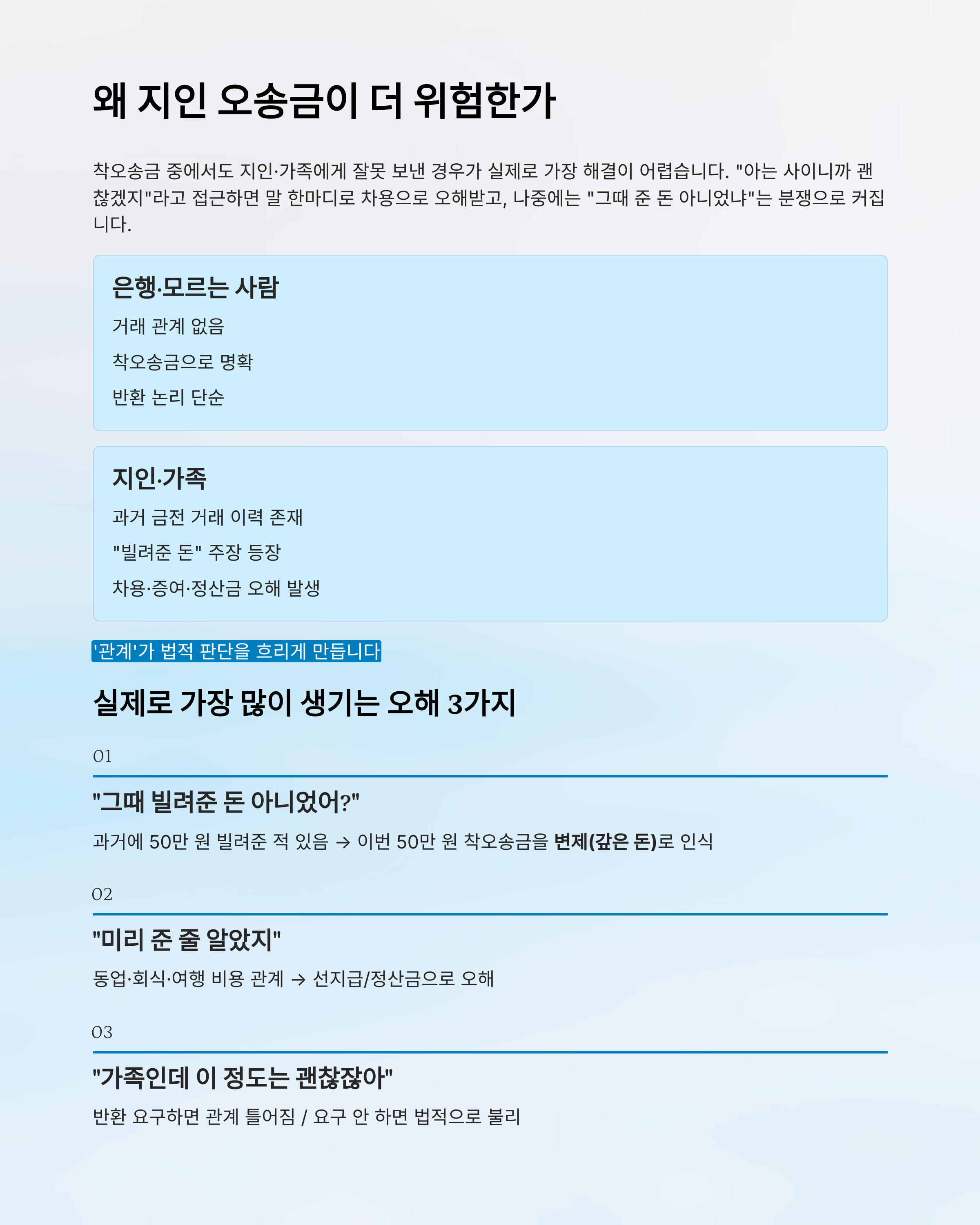 착오송금 중에서도 지인·가족에게 잘못 보낸 경우가 실제로 가장 해결이 어렵습니다.