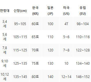 아동 속옷 연령대별 + 키 기준,