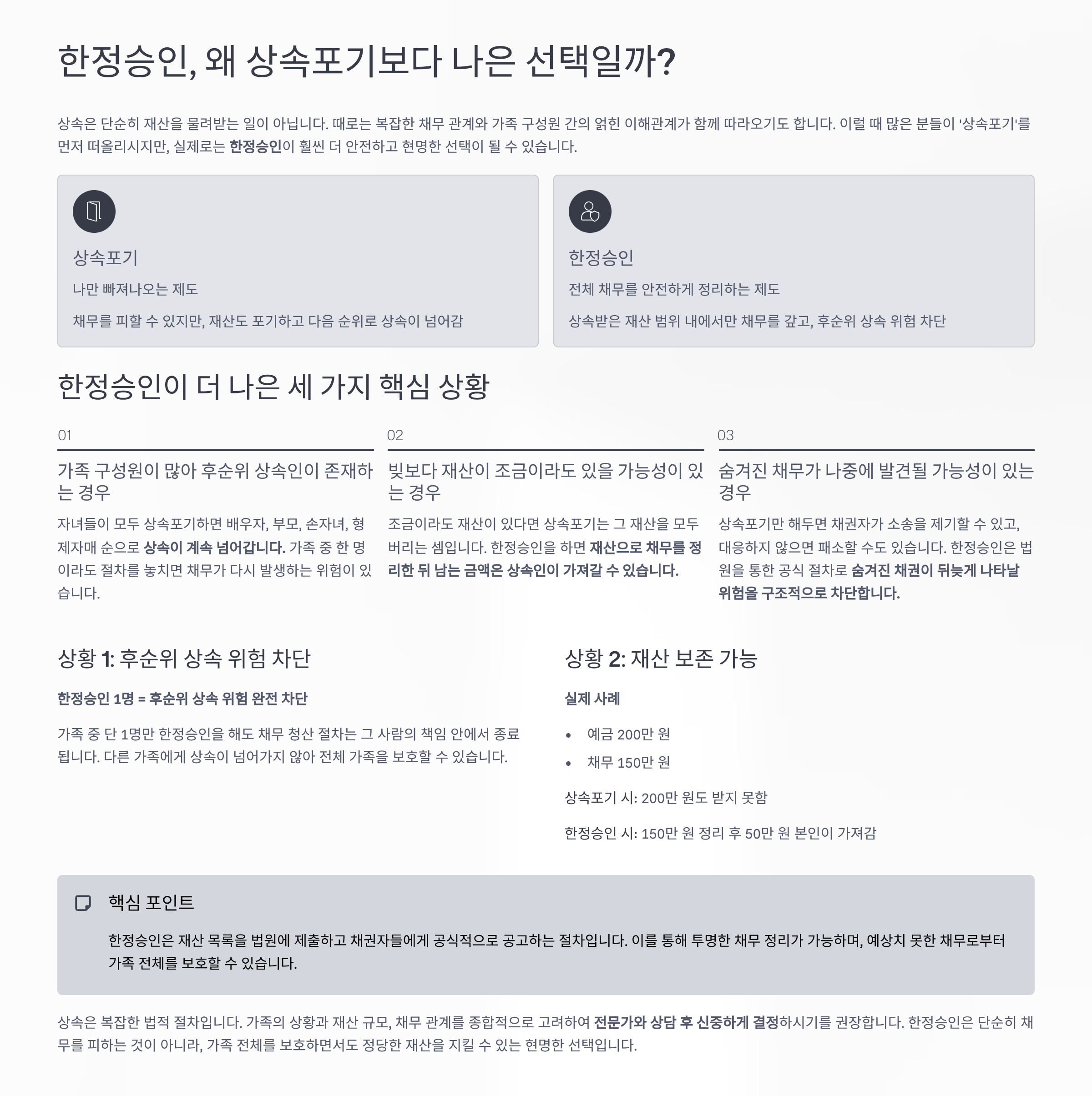 | 가족에게 미치는 영향 | 후순위 상속인에게 채무가 넘어감 → 손자·형제에게 갈 수 있음 | 한정승인 1명만 해도 채무 청산이 그 1명에서 끝남 → 가족에게 번지지 않음 |