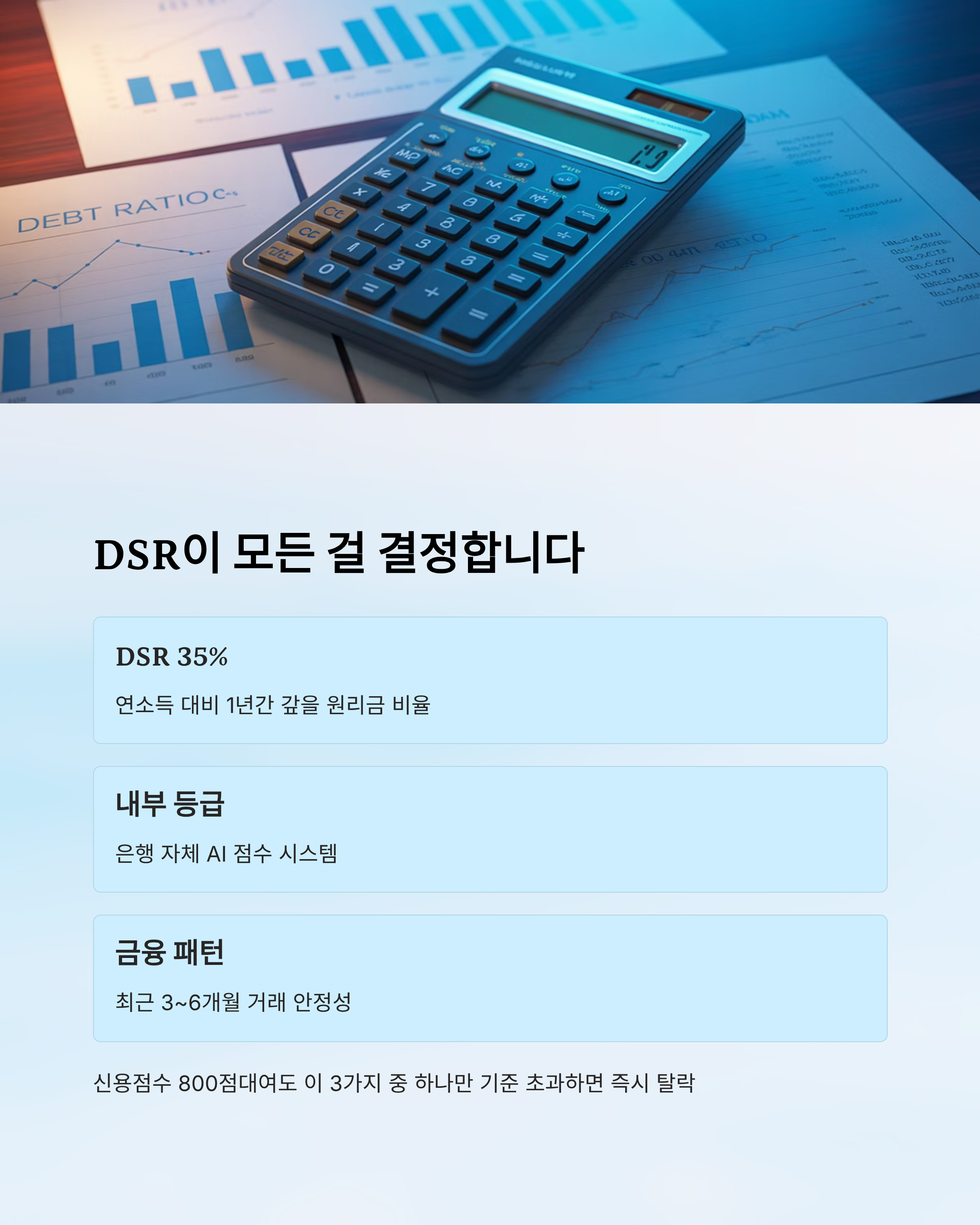 이유는 단순합니다. 이제 은행은 **신용점수보다 DSR(총부채원리금상환비율)**을 더 강하게 적용하기 때문입니다.