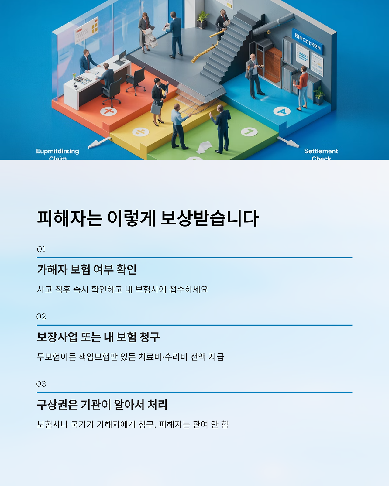 상대가 무보험이든, 책임보험만 가입했든, 피해자는 보장사업(국가 운영) 또는 자신의 자동차보험을 통해 치료비·차량 수리비·휴업손해 등을 먼저 전액 보상받을 수 있습니다.
