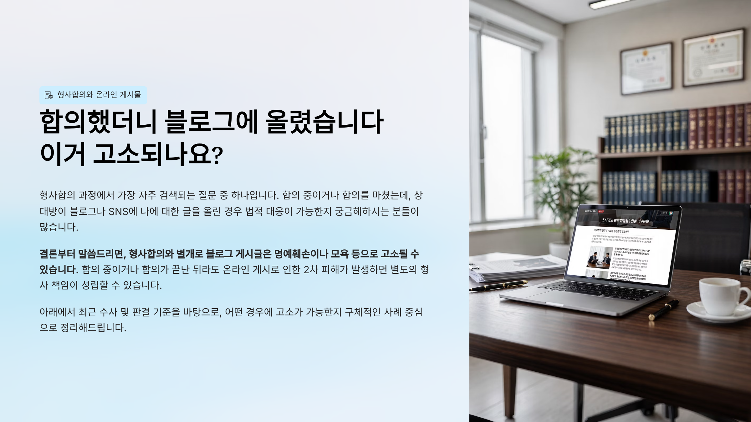 결론부터 말씀드리면 형사합의와 별개로, 블로그 게시글은 명예훼손·모욕 등으로 고소될 수 있습니다.